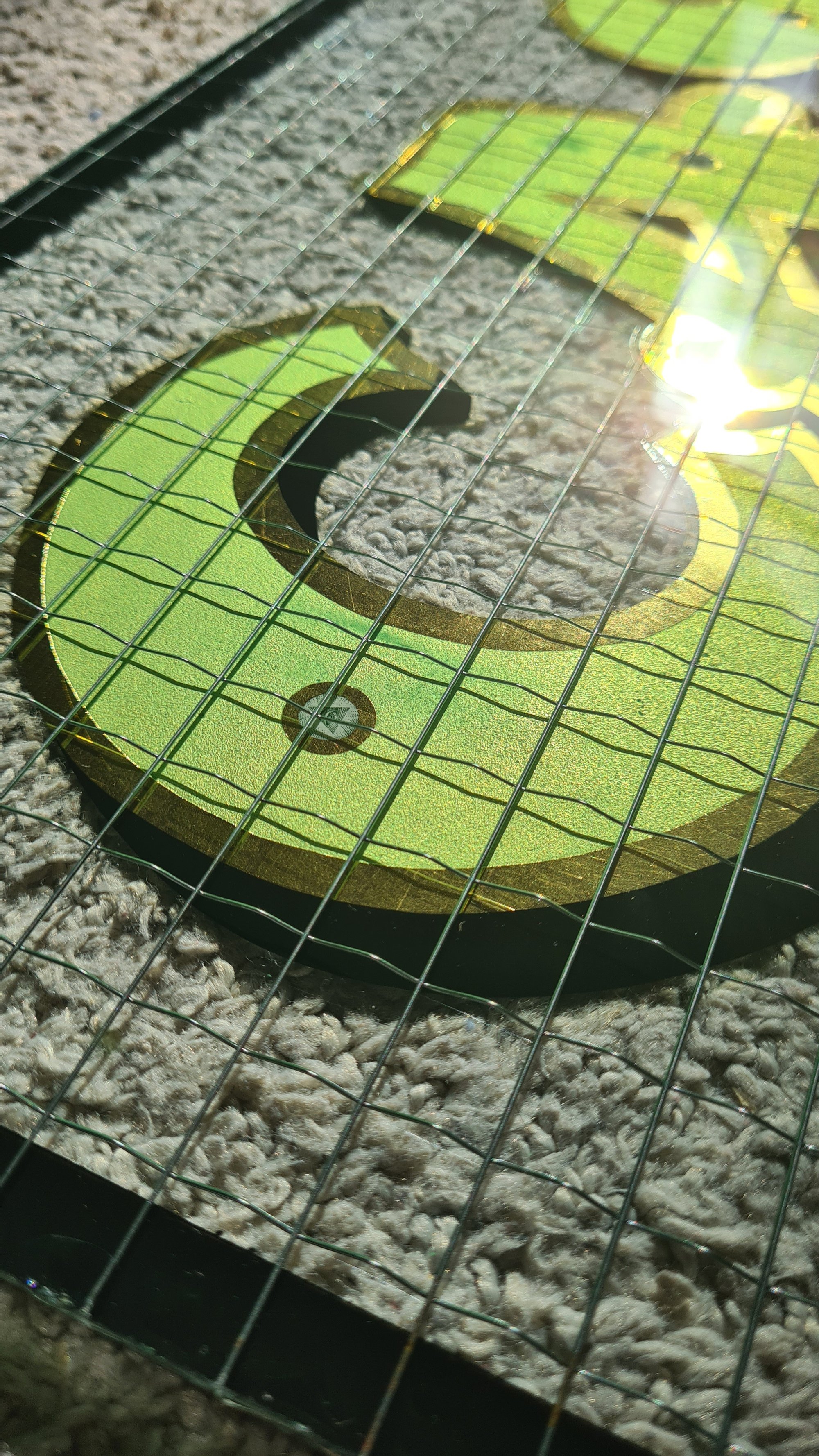 Enamel, 23kt green gold leaf and genuine dollar bill detailing on super thick security glass.
