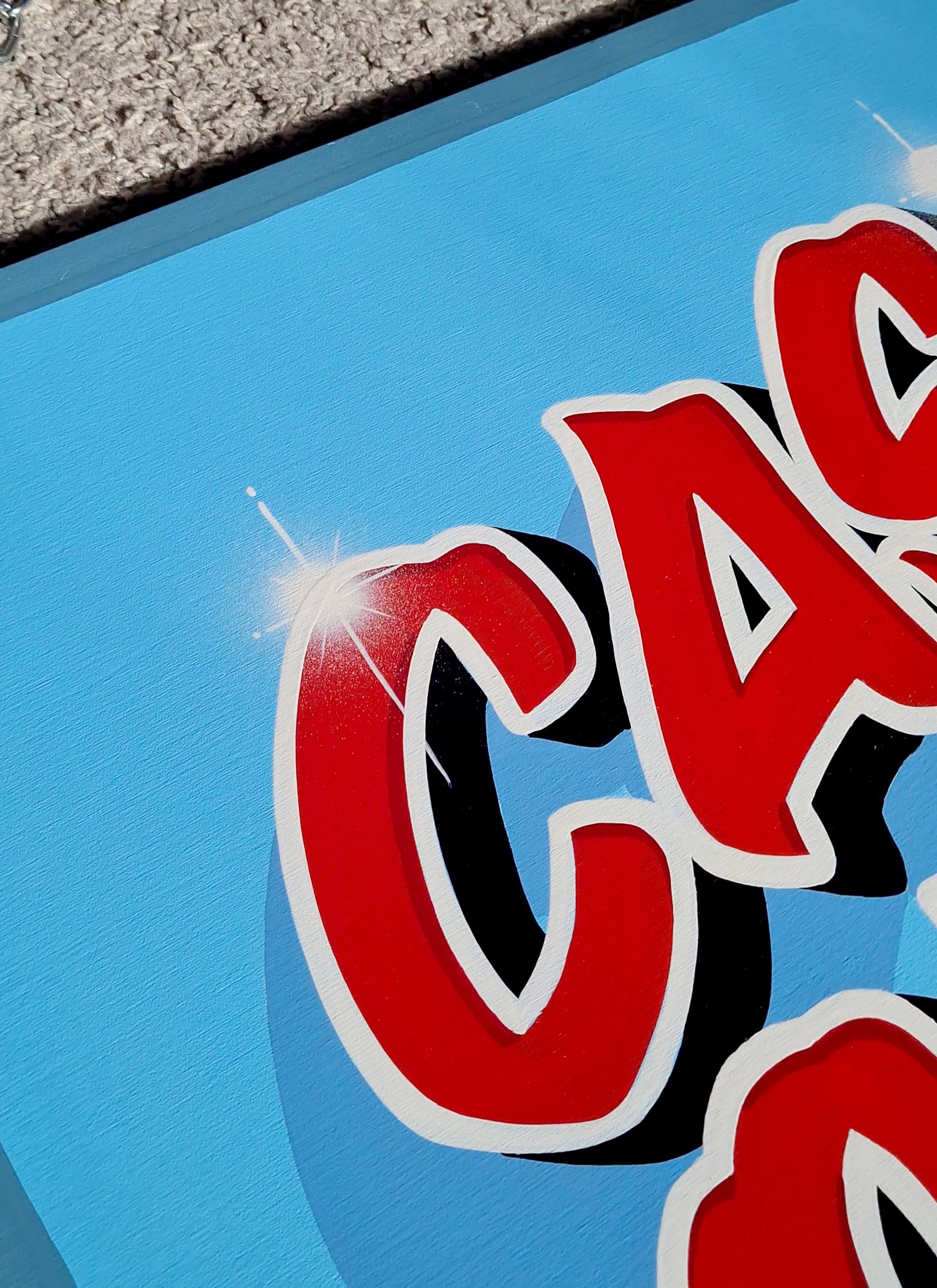 Enamel and spray paint on 12mm Birch Ply. Ready to hang with chain